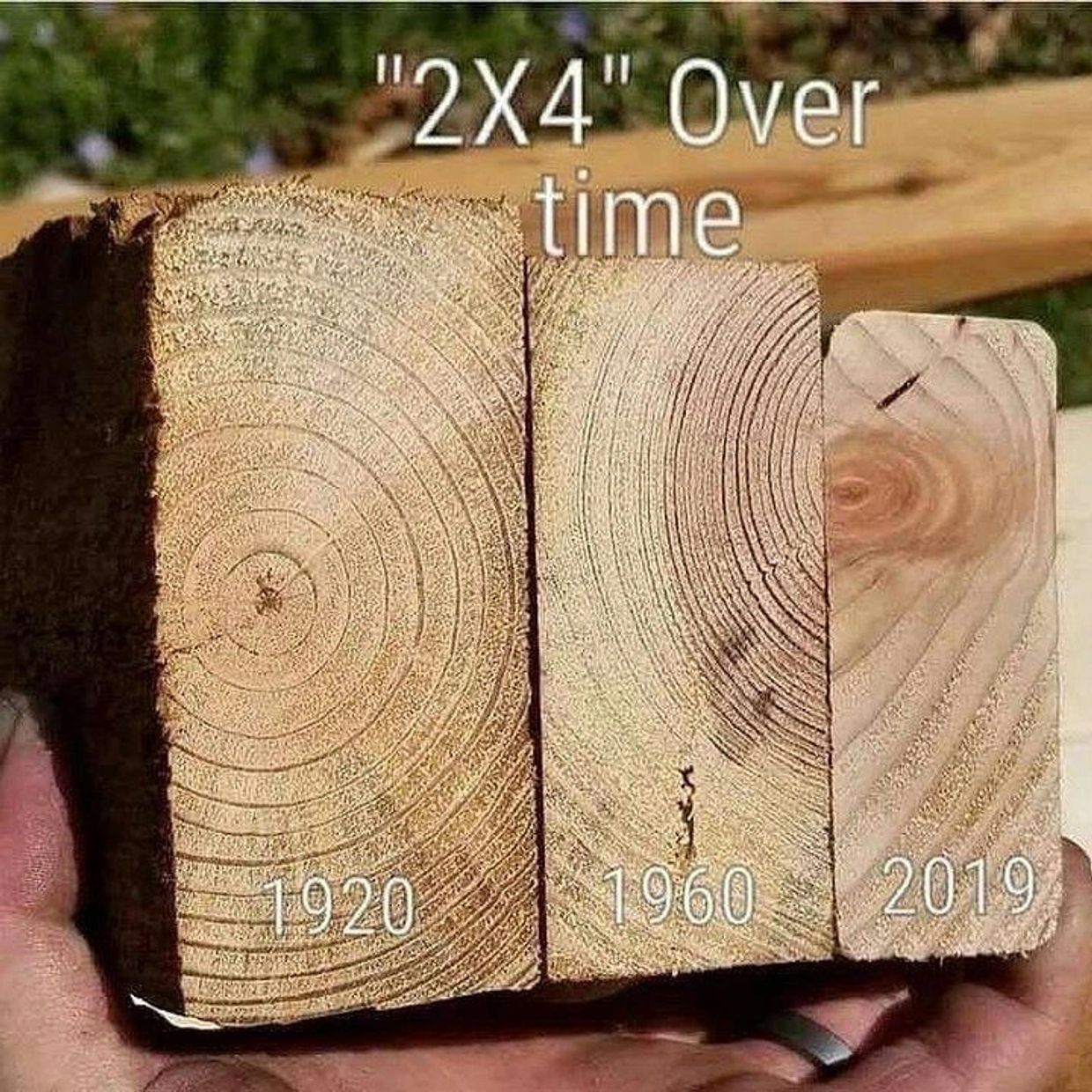 Over time the lumber industry has favored uniformity and quick dry times over full size boards. If you are renovating or repairing an old home you may find stock 2x4 are not the same size. Southern Pine grows faster and has less rings per inch. Our rough cut 2-inch nominal board will measure 1-7/8 inch.